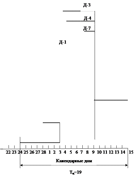 Как видно из рисунка 3.2, отдельные детали и узлы могут изготавливаться параллельно. Длительность цикла изготовления продукции определяется временем изготовления и сборки ведущей (наиболее трудоемкой) детали и временем последующих работ по изготовлению изделия. Цикловой график дает возможность определить срок запуска деталей в производство. Запускаются детали не все одновременно, а исходя из сроков подачи их на сборку и длительности производственного цикла. В нашем примере, чтобы изделие изготовить к 15 марта, необходимо запустить в производство деталь Д-8 (наиболее трудоемкую) 24 февраля (рис. 3.2)). Все другие детали будут запускаться позже, исходя из сроков опережения запуска по сравнению с выпуском.