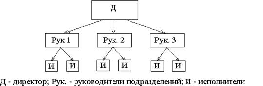 Сущность линейной (иерархической) структуры управления состоит в том, что управляющие воздействия на объект могут передаваться только одним доминантным лицом – руководителем, который получает официальную информацию только от своих, непосредственно ему подчиненных лиц, принимает решения по всем вопросам, относящимся к руководимой им части объекта, и несет ответственность за его работу перед вышестоящим руководителем (рис. 11.1).