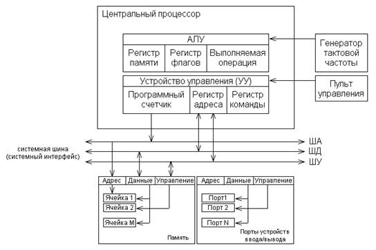Шинная организация ЭВМ является простейшей формой организации ЭВМ. В соответствие с принципами фон-Неймана подобная ЭВМ имеет следующую упрощенную схему.