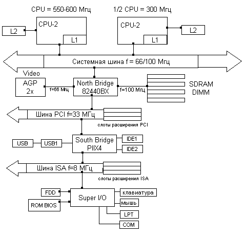 Данный чипсет разрабатывался для МП Pentium PRO, Pentium II, Celeron. Это по сути один и тот же МП, имеющий небольшое отличие в конструкции кэш-памяти. Это значит, что они могут использовать один и тот же набор микросхем с различными гнездами под процессоры: Socket 8 (PPro), Socket 370 (Celeron и Pentium) и Slot 1 (Celeron и Pentium II/III). Набор Intel 440BX – это первый набор микросхем, который поддерживает шину МП с частотой 100 Мгц. Он специально разрабатывался для поддержки новых МП с частотой 350-500 МГц.