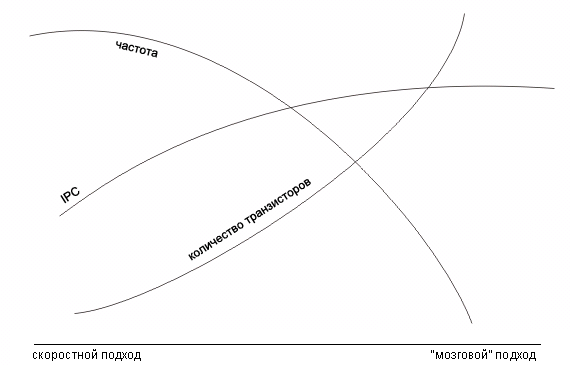 Предельные подходы при проектировании МП направлены на получение либо максимальных тактовых частот, даже за счет снижения IPC, либо максимальное количество операций за такт даже ценой снижения частоты, обозначенной как скоростной или «мозговой» подход.
