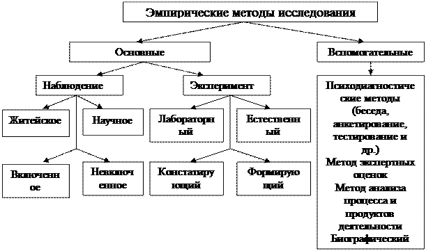 2. Эмпирические методы. Это прежде всего наблюдение и эксперимент, а также психодиагностические методы (беседа, анкетирование, тестирование и др.), метод экспертных оценок, метод анализа процесса и продуктов деятельности, биографический метод (рис. 9).