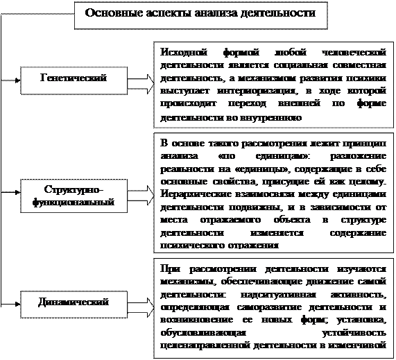 При анализе деятельности выделяют три плана ее рассмотрения: генетический, структурно-функциональный и динамический (рис. 42).