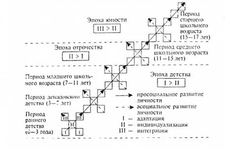 развитый А.В. Петровским подход к членению во времени процесса развития личности, позволяющему выделять его основные этапы. А.В. Петровским была выдвинута следующая гипотеза: личность формируется в группах, иерархически расположенных на ступенях онтогенеза; характер развития личности задается уровнем развития группы, в которую она включена и в которой она интегрирована. Общепризнанная в отечественной педагогике и психологии мысль А.С. Макаренко о том, что личность развивается в коллективе и через коллектив, может быть переформулирована: личность ребенка, подростка, юноши развивается в результате последовательного включения в различающиеся по уровню развития общности. Развитие личности детерминируется процессом развития группы, в которой она интегрирована и которая доминирует на данной возрастной ступени. Наиболее благоприятные условия для деятельностного формирования ценных качеств личности создает группа высокого уровня развития — коллектив. На основе этого предположения может быть сконструирована модель развития личности в конкретно-исторических условиях воспитания. При этом выделяются собственно возрастные этапы формирования личности: ранний детский (преддошкольный) возраст (0—3), детсадовское детство (3—7), младший школьный возраст (7—11), средний школьный возраст (11 — 15), старший школьный возраст (15—18). В раннем детском возрасте развитие личности осуществляется преимущественно в семье, которая в зависимости от принятой в ней тактики воспитания либо выступает как просоциальная ассоциация или коллектив (при превалировании тактики «семейного сотрудничества»), либо оборачивается для ребенка зачастую совершенно не осознаваемыми родителями отрицательными сторонами, которые присущи менее развитым группам (если в семье взрослые придерживаются, например, тактики «диктата» или же «слепой опеки»). В зависимости от характера семейных отношений изначально складывается личность ребенка либо как нежного, заботливого, не боящегося признать свои ошибки и оплошности, открытого, не уклоняющегося от ответственности маленького человека, либо как трусливого, ленивого, жадного, капризного маленького себялюбца. Важность периода раннего детства для формирования личности отмечалась многими психологами, но его роль нередко мистифицировалась (3. Фрейд и др.). В действительности ребенок с первого года своей жизни находится в достаточно развитой группе и с присущей ему активностью, связанной с особенностями его нервнопсихической организации, усваивает сложившийся в этой группе тип отношений, претворяя эти отношения в черты своей формирующейся личности. Фазы развития личности в преддошкольном возрасте имеют следующие результаты: первая — адаптацию на уровне освоения простейших навыков, овладения языком как средством приобщения к социуму при первоначальном неумении выделить свое Я из окружающих предметов, вторая — индивидуализацию, противопоставление себя окружающим: «моя мама», «я мамина», «мои игрушки» и т.д., демонстрирование в поведении своих отличий от окружающих; третья — интеграцию, позволяющую управлять своим поведением, считаться с окружающими, подчиняться требованиям взрослых и предъявлять им разумные требования, с которыми взрослые готовы считаться. Воспитание ребенка, начинаясь и продолжаясь в семь