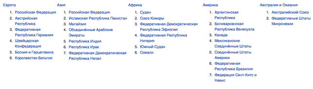 > конфедерация (Европейский Союз (условно), Сербия и Черногория (Сербия+Черногория, 2003—2006), Сенегамбия (Сенегал+Гамбия, 1982—1989), Союз Африканских Государств (Мали+Гана+Гвинея, 1960—1962). Несмотря на названия, фактическими конфедерациями были Объединённая Арабская Республика (Египет+Сирия, 1958—1961; Египет+Сирия+Ирак, 1963), Арабская Федерация (Ирак+Иордания, 1958), Федерация Арабских Республик (Египет+Сирия+Ливия, 1971), Арабская Исламская Республика (Ливия+Тунис, 1974),