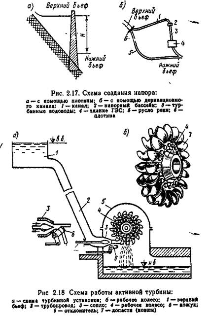 Напор Н увеличивают на равнинных реках с помощью плотины (рис. 2.17, а), а в горных местностях строят специальные обводные каналы, называемые деривационными (рис. 2.17, б)