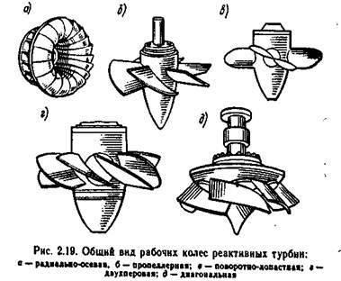 За счет кривизны лопастей изменяется направление потока воды, при котором, как и в активной турбине, кинетическая энергия воды в результате действия центробежных сил превращается в механическую энергию турбины. Рабочее колесо реактивной турбины в отличие от активной полностью находится в воде, т. е. поток воды поступает одновременно на все лопасти рабочего колеса. Различные конструкции рабочих колес реактивных турбин показаны на рис. 2.19.