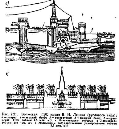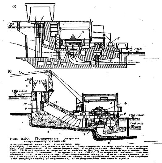 На равнинных реках ГЭС с плотинной схемой концентрации напора разделяются на два типа: русловые и приплотинные. При напоре до 30 м здание станции, как и плотина, воспринимает напор и располагается в русле реки (рис. 2.20, а). Такие ГЭС называются русловыми. Так как с ростом напора увеличивается объем строительных работ по сооружению зданий русловых гидроэлектростанций, то при напорах, превышающих 25—30 м, здание станции помещается за плотиной (рис. 2.20, б). Такие ГЭС называются приплотинными. На них весь напор воспринимается плотиной.