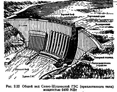 На рис. 2.21 показана Волжская ГЭС имени В. И. Ленина, а на рис. 2.22 —Саяно-Шушенская ГЭС на р. Енисей, у которой высота плотины составляет 240 м и вода по водоводам поступает к 10 турбинам, вращающим электрические генераторы мощностью по 640 МВт каждый.