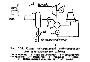 Структурная схема геотермальной электростанции для вулканических районов приведена на рис. 3.13. Схема электростанции для вулканических районов, располагающих ресурсами термальных вод с температурой 100°С на глубинах, доступных для современной буровой техники, приведена на рис. 3.14.