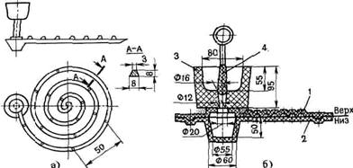 Рис. 13 Спиральная проба (а) и литейная форма (б) для определения жидкотекучести сплавов: 1, 2 - нижняя и верхняя полуформы, 3 - заливочная чаша, 4 - графитовая пробка