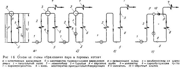 В парообразующих трубах совместное движение воды и пара и преодоление гидравлического сопротивления этих труб в котлах различных типов организовано по-разному. Различают паровые котлы с естественной циркуляцией, с принудительной циркуляцией и прямоточные.