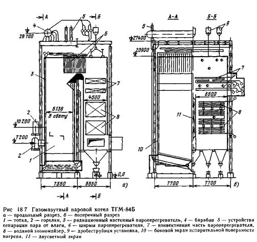 Барабанные котлы с естественной циркуляцией. На рис. 18.7 изображены газомазутный котел марки ТГМ-84Б производительностью 420 т/ч при давлении вырабатываемого пара 13,7 МПа (140 кгс/см2) и температуре 560 °С. Этот котел имеет сравнительно небольшие размеры (высота до оси барабана всего 28,7м). Топка котла разделена на две симметричные камеры (полутопки) вертикальным, воспринимающим излучение с двух сторон (двусветным) экраном. Первая ступень пароперегревателя этого котла выполнена из трубных панелей, расположенных по всей высоте фронтовой стены обеих полутопок, и является фронтовым экраном Потолок также закрыт сплошным рядом труб, образующих потолочный экран. Это — вторая часть пароперегревателя (радиационный потолочный пароперегреватель). Третьей ступенью пароперегревателя являются разреженные пакеты вертикальных змеевиков, так называемые ширмы, расположенные отчасти в топке и воспринимающие излучением от горячих топочных газов значительную часть теплоты. Последняя ступень — горизонтальные пакеты труб в конвективном газоходе (конвективный пароперегреватель). В результате радиацией передается до 60 % всей теплоты, воспринимаемой пароперегревателем.