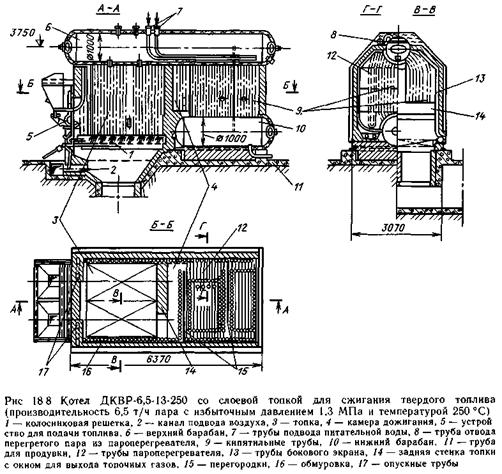 ДКВР (рис. 18.8) —двухбарабанные котлы с естественной циркуляцией и экранированной топочной камерой. Барабаны расположены вдоль оси котла, между ними размещен коридорный пучок кипятильных труб Движение топочных газов — горизонтальное с поперечным смыванием труб и поворотами. Повороты топочных газов обеспечиваются установкой перегородок, первая из которых выполнена из шамотного кирпича, вторая — из чугуна. Боковые экранные трубы верхними концами закреплены в верхнем барабане, нижние концы экранных труб приварены к нижним коллекторам. Передние опускные трубы, расположенные в обмуровке, являются также дополнительной опорой верхнего барабана. Пароперегреватель, если он имеется, размещается вместо части труб кипятильного пучка (обычно первого газохода). Вход пара в пароперегреватель — непосредственно из барабана, выход — в коллектор, расположенный над перекрытием топки.