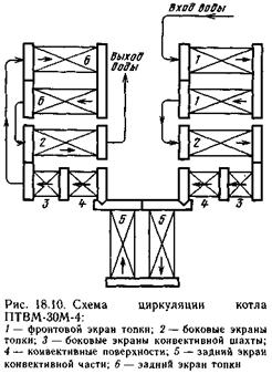 Циркуляционная схема котла приведена на рис. 18.10. Вода подводится к фронтовому экрану топочной камеры, выводится — из бокового экрана топки.