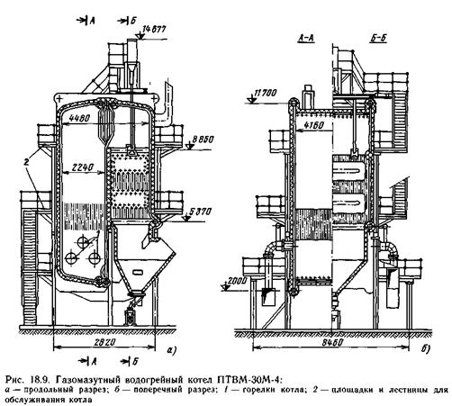 На рис. 18.9 изображен общий вид газомазутного водогрейного котла типа ПТВМ-ЗОМ-4 теплопроизводительностью при работе на мазуте 41 МВт (35 Гкал/ч), хорошо зарекомендовавшего себя в эксплуатации. Котел имеет П-образную компоновку и оборудован шестью газомазутными горелками (по три на каждой боковой стене) с мазутными форсунками механического распыливания Топочная камера котла полностью экранирована трубами диаметром 60 мм. Конвективная поверхность нагрева выполнена из горизонтальных труб диаметром 28 мм Конвективная шахта также экранирована. Облегченная обмуровка котла крепится непосредственно на трубы, опирающиеся, в свою очередь, на каркасную раму. Котлы этого типа, предназначенные для работы на мазуте, оборудуются дробеочистительной установкой.