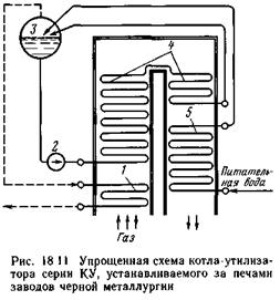 Котлы-утилизаторы. Для использования теплоты отходящих газов различных технологических установок, в том числе и печей, применяются котлы-утилизаторы, вырабатывающие, как правило, пар. При высоких температурах газов (более 900 °С) эти котлы снабжаются радиационными (экранными) поверхностями нагрева и имеют такую же компоновку, как и обычный паровой котел, только вместо топки — радиационная камера, в которую снизу входят газы. Воздухоподогреватель отсутствует, если нет необходимости в горячем воздухе для нужд производства. Газы сначала охлаждаются в радиационной камере, как в топке «обычного» котла. Большой свободный объем этой камеры позволяет иметь повышенную толщину излучающего слоя и, как следствие, повышенную степень черноты газов. Поэтому здесь преобладает передача теплоты излучением.