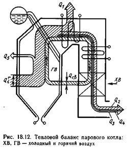 Тепловой баланс парового котла с обозначением основных составляющих приходной и расходной частей приведен на схеме рис. 18.12. Замкнутый контур на рисунке представляет теплоту горячего воздуха Qr в, забираемую от продуктов сгорания при относительно низкой температуре и передаваемую в топку.