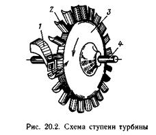 В простейшей активной турбине рабочее тело поступает в сопло / (или группу сопл), разгоняется в нем до высокой скорости и направляется на рабочие лопатки 2 (рис. 20.2). Усилия, вызванные поворотом струи в каналах рабочих лопаток (см. рис. 20.1, в), вращают диск 3 и связанный с ним вал 4. Диск с закрепленными на нем рабочими лопатками и валом называется ротором. Один ряд сопл и один диск с рабочими лопатками составляют ступень.