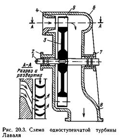 Одноступенчатая активная турбина была построена Лавалем в 1883г. (рис. 20.3).