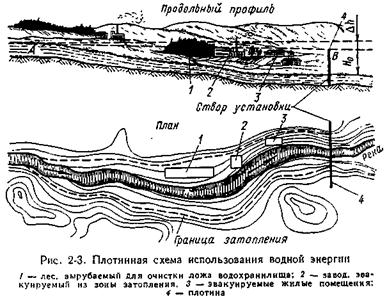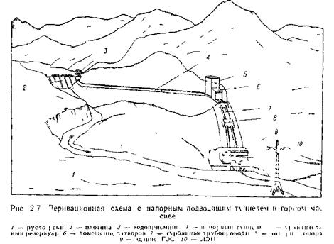 Деривационные схемы установок выгодны в горных условиях, при больных уклонах свободной поверхности возы в реке и сравнительно малых используемых расходах, когда при относительно небольшой длине и малых поперечных размерах деривации можно получить большой напор и большую мощность ГЭС. При благоприятных геологических и топографических условиях на горной реке может быть применена и плотинная схема. Посредством плотины можно создать водохранилище для регулирования стока реки.