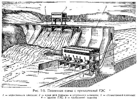 При средних и больших напорах, превышающий диаметр трубы более чем в 4-5 раз, здание ГЭС не может входить в состав напорного фронта. В таких случаях строят приплотинную ГЭС, здание которой располагается за плотиной и не воспринимает плотного давления воды (рис 2-5). Подвод воды к турбинам такой ГЭС осуществляется трубопроводами, размещенными в теле или поверх бетонной плотины, под земляной плотиной или туннелями, прокладываемыми в обход плотины.