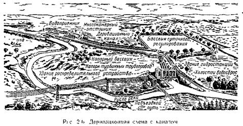 При деривационной схеме высота плотины может быть небольшой, обеспечивающей лишь отвод воды из реки в деривацию, а сосредоточенный напор получается за счет разности уклонов воды в реке и в деривации. На рис 2-6 приведена схема ГЭС с деревацией в виде открытого канала. Плотина создает небольшой подпор. Из подпертого бьефа вода по деревационному каналу поступает в напорный бассейн, откуда она подается по трубопроводам к турбинам ГЭС. От турбин вода по отводящему каналу направляется в реку или деревацию следующей ГЭС или же в ирригационный оросительный канал.