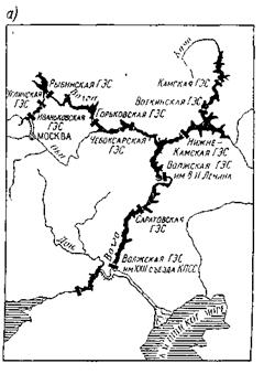 На рис. 2-9 приведена схема Волжско-Камского каскада ГЭС и водохранилищ. Река Волга имеет длину 3690 км и общее падение 250 м. Ступенчатой линией показаны проектные уровни воды после осуществления всей схемы реконструкции Волги.