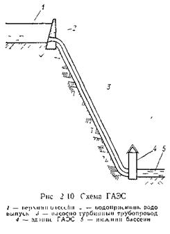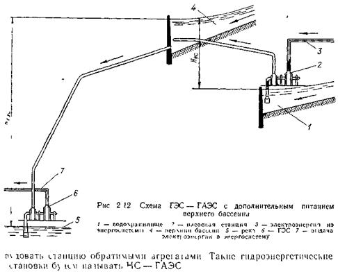 Если имеется значительный приток воды к верхнему бассейну, то электростанция становится ГЭС —ГАЭС. При напорах до 35—45 м такие электростанции будут руслового типа, при Н более 45 м — приплотинного или деривационного типа. Компоновка сооружений ГЭС — ГАЭС аналогична ГЭС, а необходимость иметь верхний и нижний бассейны и возможность перекачки воды из нижнего бассейна в верхний присущи ГАЭС.