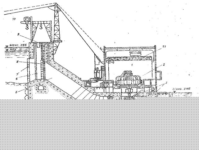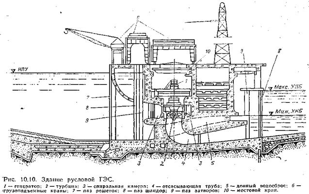 здания русловой ГЭС, т. е. здания, воспринимающие напор (рис. 10.10);