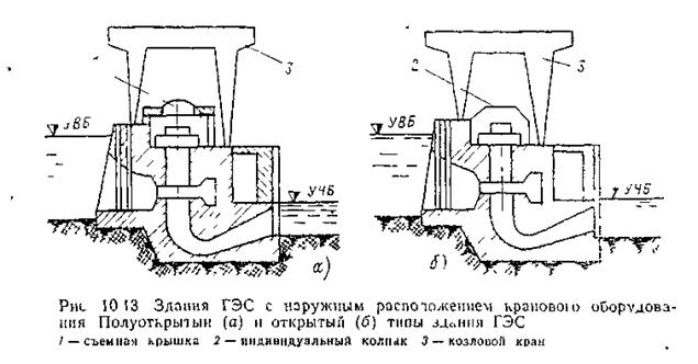 открытыми—машинный зал отсутствует, а генераторы укрыты колпаками (рис. 10.13,6). Подъемным оборудованием здесь является также портальный кран.