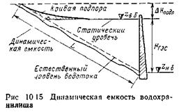 До сих пор принималось, что поверхность воды в водохранилище по всей его длине устанавливается горизонтально, образуя так называемый его статический объем. Очевидно, это может быть лишь в том случае, когда приточность в водохранилище отсутствует. Так как в действительности в водохранилище вceгда имеется приток воды, то, строго говоря, поверхность воды по его длине не будет горизонтальной. Это особенно относится к его «хвостовой части», где кривая свободной поверхности воды представляет собой кривую подпора, характеризующую изменение уровня поверхности воды по длине водотока Образовавшимся объем называется динамическим объемом водохранилища (рис 10 15). Величина его определяется к основном значением расхода приточности и во время половодий может быть весьма значительной.