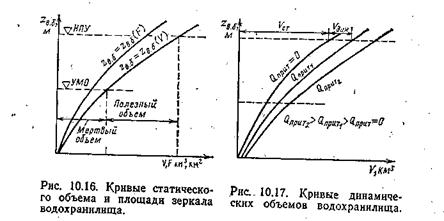При учете динамической емкости, как было показано выше, объем водохранилища при заданной отметке уровня в створе плотины будет определяться приточностью. Вследствие этого зависимость между значениями уровня и объемом водохранилища будет иметь другой характер, так как будет функцией двух переменных Zнб=Zнв(V,Qприт). Эти кривые (рис. 10.17) называются кривыми динамического объема в отличие от кривой статического объема, изображенной на рис. 10.16, или кривой, соответствующей Qприт=0.