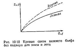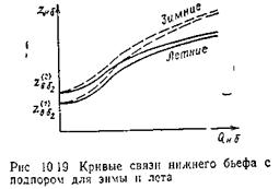Зимой при переменном расходе ГЭС в ее нижнем бьефе на берегах образуются наледи, которые уменьшают площадь живого сечения. Поэтому при одних и тех же отметках уровня зимой будет проходить расход меньше, чем летом, и зимняя кривая связи соответственно будет выше, чем летняя (рис. 10.18 и 10.19).