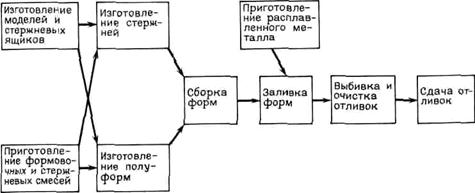 Литье в песчаные формы в настоящее время является универсальным и самым распространенным способом изготовления отливок. Технологический процесс изготовления отливок состоит из ряда основных и вспомогательных операций, выполняемых в определенной последовательности (рис. 14). Для изготовления литейных форм используются модельный комплект, формовочные и стержневые смеси и другие материалы и оборудование.