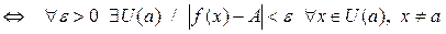 , сколь малым бы оно ни было, можно указать такую окрестность U (a) точки х = а (не включающую саму точку а), что при всех х, принадлежащих этой окрестности, выполняется неравенство