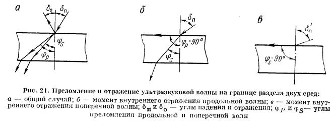 Если ультразвуковой луч падает на границу раздела перпендикулярно, происходит только отражение. При угле падения δп > 0° происходит как отражение, так и преломление упругой волны. Постепенным увеличением угла δп можно добиться такого момента, когда произойдет полное внутреннее отражение (угол преломления φ = 90°) сначала продольной (первый критический угол δп) затем поперечной волны (второй критический угол δп, рис. 21).