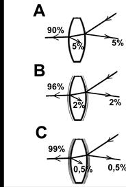 Непросветленная оптическая линза, имея две преломляющие поверхности, соприкасающиеся с воздухом, отражает около 10 % света, входящего в нее (А). Однослойное покрытие преломляющих поверхностей линзы уменьшает потери света до 4 % (В). Многослойными покрытиями достигают уменьшения потерь света на отражение до 1 % (С).