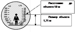 По левой шкале вы можете определить расстояние до объекта, если его линейный размер достигает 6 м (телеграфный столб) и более. По правой шкале вы можете определить расстояние до объекта, в случае когда его размеры соизмеримы с ростом человека – 1,75 м.