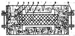 Рис.18 Форма в сборе: 1-опока, 2-литниковая чаша, 3-стояк, 4-шлакоуловитель, 5-стержень, 6-полость литейной формы, 7-вентиляционный канал, 8-выпор, 9-штырь