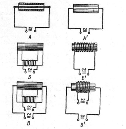 б) в поле соленоида (рис. 7.1. Б') при этом достигается продольное или поперечное намагничивание;