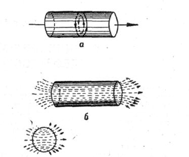 а) в поле постоянного или переменного тока большой силы, пропускаемого через деталь (рис. 7. 1, А') или через медный проводник (стержень), вставленный внутрь пустотелой детали (рис. 7.1, А); при этом деталь намагничивается циркулярным потоком магнитных силовых линий, расположенных в плоскости, перпендикулярной направлению тока, и имеющих вид замкнутых контуров (рис. 7. 2, а);