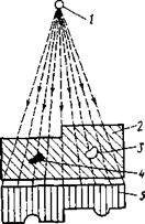 Физика процесса. Выявление внутренних дефектов при просвечивании основано на способности ионизирующего излучения неодинаково проникать через различные материалы и поглощаться в них в зависимости от толщины, рода (плотности) материалов и энергии излучения. Для выявления дефектов в изделиях с одной стороны устанавливают источник излучения, с другой — детектор, регистрирующий информацию о внутреннем строении контролируемого объекта (Рис. 12.1). Излучение от источника 1 проходит через изделие 2, имеющее внутренние дефекты 3, 4 с разной плотностью. В дефектном и бездефектном местах оно будет поглощаться по-разному и выходить на детектор с разной интенсивностью 5. Интенсивность излучения при прохождении через дефект 3, заполненный воздухом или газом, ослабляется меньше, чем в сплошном металле, а сильнее — над дефектом 4, заполненным более плотным материалом (например, вольфрамом), чем основной.
