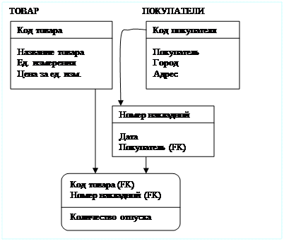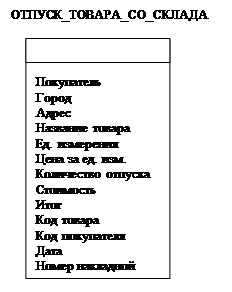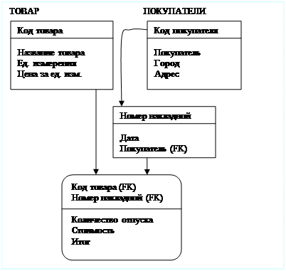 Определим поля «Код товара», «Код покупателя», «Дата» и «Номер накладной» как ключевые. Выделим в отдельные таблицы информацию, связанную с товаром, покупателями и накладными. Определим связь 1:1 между таблицами ПОКУПАТЕЛИ и НАКЛАДНЫЕ, и связь 1:М между таблицами НАКЛАДНЫЕ и ОТПУСК_ТОВАРА_СО_СКЛАДА, ТОВАР и ОТПУСК_ТОВАРА_СО_СКЛАДА.