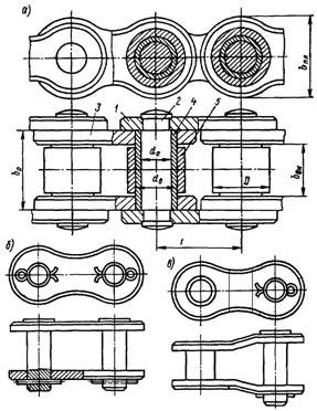 Рассмотрим конструкцию роликовой цепи, как наиболее часто применяемой (рис. 3.2). Эта цепь состоит из звеньев двух типов: звена с наружными пластинами 1, соединенными между собой двумя осями 2, и звена с внутренними пластинами 3, которые соединены между собой втулками 4. Втулки 4 при сборке цепи одеваются на оси 2 с возможностью проворота, образуя таким образом шарнир цепи. На каждую из втулок 4 одевается свободно вращающийся ролик 5. Цепь проектируется чаще всего с четным числом звеньев, тогда замыкающим звеном, соединяющим концы цепи в замкнутое кольцо, является звено с наружными пластинами, оси которого могут выниматься и закрепляются при сборке разрезной шайбой или шплинтом (рис. 3.2, б). Иногда допускается использование в цепи и нечетного числа звеньев. В этом случае для замыкания цепи применяется специализированное звено с неодинаковыми концевыми частями (рис. 3.2, в). Однако, применение такого звена нежелательно в связи с его пониженной прочностью в сравнении с другими звеньями цепи.