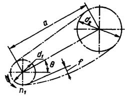 Полученное расчетом по (3.6) значение межосевого расстояния с целью исключения перенатяжения цепи из-за неточностей изготовления и монтажа сокращают на 0,2…0,4%, так чтобы свободная (ведомая) ветвь цепи имела некоторое провисание f (рис. 3.3). Для передачи, у которой угол q наклона межосевой линии к горизонту не превышает 40°, величина провисания ведомой ветви цепи