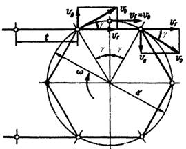 Эта тангенциальная скорость всегда может быть представлена горизонтальной Vг и вертикальной Vв составляющими.Cоставляющие тангенциальной скорости звездочки для места входа шарнира цепи во впадину звездочки (на схеме рис. 3.4 левый шарнир верхней, набегающей, ветви цепи) и для предыдущего шарнира, уже движущегося совместно со звездочкой (на схеме рис. 3.4 правый верхний шарнир) по величине составляют