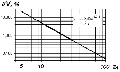 Рис. 3.5. Относительная пульсация скорости цепи в зависимости от количества зубьев ведущей звёздочки. |