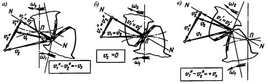 В процессе работы эвольвентной зубчатой передачи рабочие участки профилей зубьев одновременно обкатываются и скользят друг по другу (рис. 5.4.). Учитывая, что тангенциальные скорости зубьев в полюсе зацепления для шестерни и колеса равны между собой, и разлагая тангенциальные скорости v1 и v2 контактирующих точек сопряженных зубьев на две составляющих, одна из которых (v1’ и v2’) направлена по линии зацепления (то есть по нормали к взаимодействующим поверхностям зубьев), а вторая (v1” и v2”) – перпендикулярно к ней (то есть по касательной к поверхности контакта), обнаруживаем, что в момент прохождения точки контакта через полюс зацепления касательные скорости контактирующих профилей равны нулю, и скольжение профилей отсутствует (рис. 5.4, б). Во всех остальных случаях касательная скорость части профиля зуба, прилегающей к головке, больше аналогичной скорости контактирующего профиля сопряженного зуба, прилегающего к ножке последнего (рис. 5.4, а, в). Поскольку протяженность профилей ножки и головки примерно одинаковы, ножка зуба работает в наиболее неблагоприятных условиях (дольше работает в условиях трения скольжения), что ведет к её более интенсивному изнашиванию.