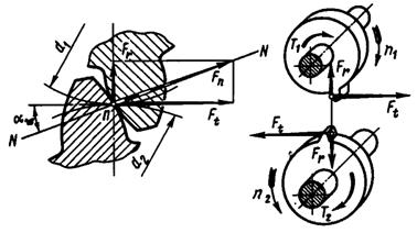 Рис. 5.5. Силы в прямозубой цилиндрической передаче.